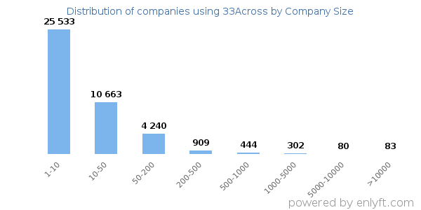 Of all the customers that are using 33Across, a majority (75%) are small (<50 employees), 7% are large (>1000 employees) and 17% are medium-sized.