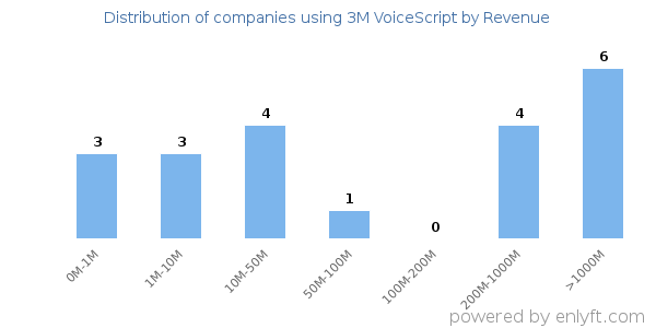 We have data on 21 companies that use 3M VoiceScript. The companies using 3M VoiceScript are most often found in United States and in the Hospital & Health Care industry. 3M VoiceScript is most often used by companies with >10000 employees and >1000M dollars in revenue. Our data for 3M VoiceScript usage goes back as far as 9 years and 3 months.