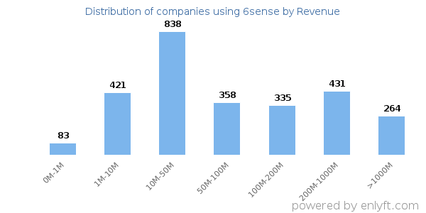 We have data on 2,986 companies that use 6sense. The companies using 6sense are most often found in United States and in the Computer Software industry. 6sense is most often used by companies with 50-200 employees and 10M-50M dollars in revenue. Our data for 6sense usage goes back as far as 9 years and 3 months.