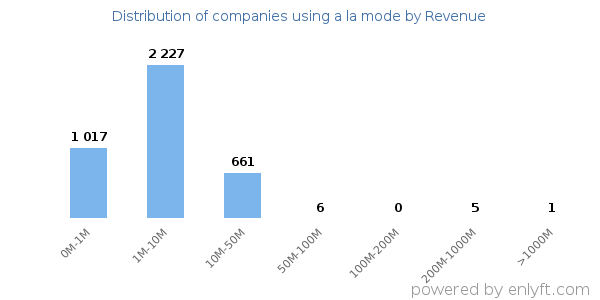 We have data on 4,856 companies that use a la mode. The companies using a la mode are most often found in United States and in the Real Estate industry. a la mode is most often used by companies with 1-10 employees and 1M-10M dollars in revenue. Our data for a la mode usage goes back as far as 5 years and 2 months.