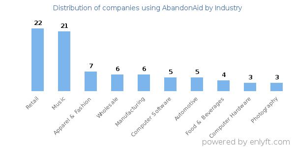 We have data on 207 companies that use AbandonAid. The companies using AbandonAid are most often found in United States and in the Retail industry. AbandonAid is most often used by companies with 1-10 employees and 1M-10M dollars in revenue. Our data for AbandonAid usage goes back as far as 8 years and 10 months.
