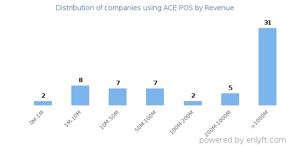 We have data on 65 companies that use ACE POS. The companies using ACE POS are most often found in United States and in the Retail industry. ACE POS is most often used by companies with >10000 employees and >1000M dollars in revenue. Our data for ACE POS usage goes back as far as 8 years and 5 months.