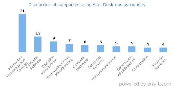 We have data on 146 companies that use Acer Desktops. The companies using Acer Desktops are most often found in United States and in the Information Technology and Services industry. Acer Desktops is most often used by companies with >10000 employees and >1000M dollars in revenue. Our data for Acer Desktops usage goes back as far as 8 years and 8 months.