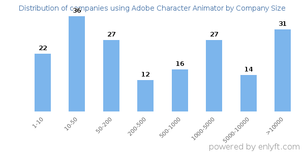 Of all the customers that are using Adobe Character Animator, 30% are small (<50 employees), 28% are medium-sized and 37% are large (>1000 employees).