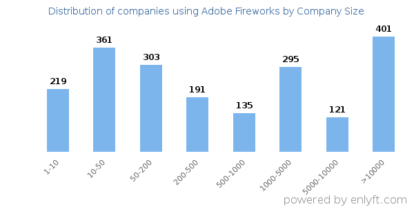 Of all the customers that are using Adobe Fireworks, 29% are small (<50 employees), 31% are medium-sized and 40% are large (>1000 employees).