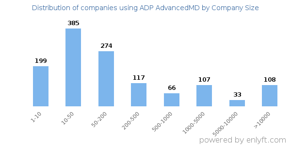 Of all the customers that are using ADP AdvancedMD, a majority (70%) are small (<$50M), 19% are large (>$1000M) and 7% are medium-sized.
