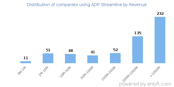 We have data on 588 companies that use ADP Streamline. The companies using ADP Streamline are most often found in United States and in the Computer Software industry. ADP Streamline is most often used by companies with 1000-5000 employees and >1000M dollars in revenue. Our data for ADP Streamline usage goes back as far as 9 years and 4 months.