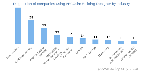 Looking at AECOsim Building Designer customers by industry, we find that Construction (21%), Civil Engineering (14%), Architecture & Planning (9%) and Information Technology and Services (5%) are the largest segments.