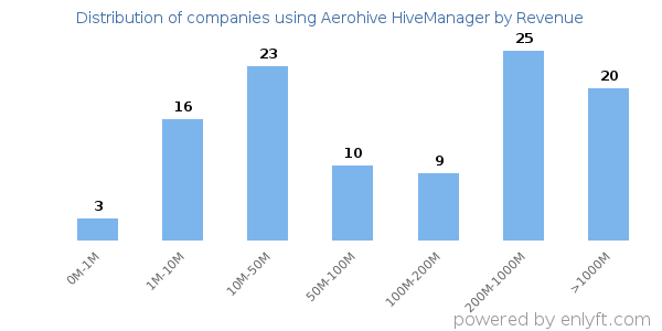 We have data on 110 companies that use Aerohive HiveManager. The companies using Aerohive HiveManager are most often found in United States and in the Information Technology and Services industry. Aerohive HiveManager is most often used by companies with 1000-5000 employees and 200M-1000M dollars in revenue. Our data for Aerohive HiveManager usage goes back as far as 8 years and 8 months.