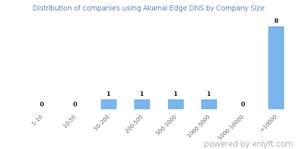 Of all the customers that are using Akamai Edge DNS, a majority (62%) are large (>1000 employees), 0% are small (<50 employees) and 6% are medium-sized.