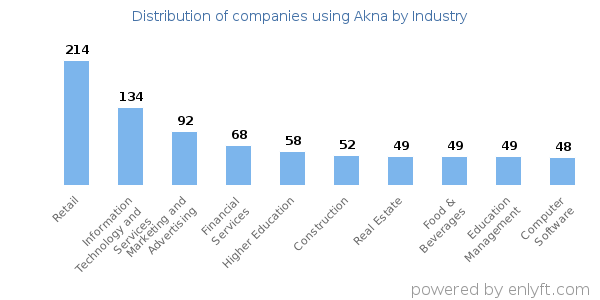 Looking at Akna customers by industry, we find that Retail (9%) and Information Technology and Services (6%) are the largest segments.