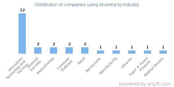 We have data on 32 companies that use Akumina. The companies using Akumina are most often found in United States and in the Information Technology and Services industry. Akumina is most often used by companies with >10000 employees and >1000M dollars in revenue. Our data for Akumina usage goes back as far as 2 years and 2 months.