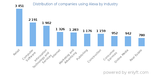 We have data on 54,350 companies that use Alexa. The companies using Alexa are most often found in United States and in the Retail industry. Alexa is most often used by companies with 1-10 employees and 1M-10M dollars in revenue. Our data for Alexa usage goes back as far as 8 years and 11 months.