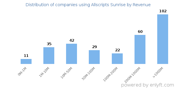 Of all the customers that are using Allscripts Sunrise, a majority (52%) are large (>$1000M), 25% are small (<$50M) and 16% are medium-sized.