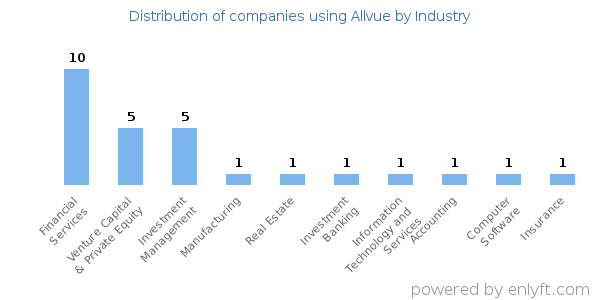 We have data on 27 companies that use Allvue. The companies using Allvue are most often found in United States and in the Financial Services industry. Allvue is most often used by companies with 1000-5000 employees and >1000M dollars in revenue. Our data for Allvue usage goes back as far as 1 years and 8 months.