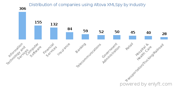 Looking at Altova XMLSpy customers by industry, we find that Information Technology and Services (20%), Computer Software (10%), Financial Services (9%) and Insurance (5%) are the largest segments.