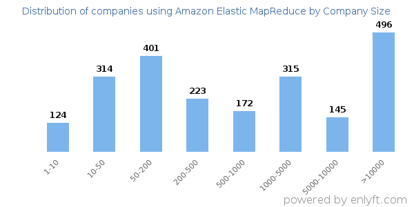 We have data on 2,246 companies that use Amazon Elastic MapReduce. The companies using Amazon Elastic MapReduce are most often found in United States and in the Information Technology and Services industry. Amazon Elastic MapReduce is most often used by companies with >10000 employees and >1000M dollars in revenue. Our data for Amazon Elastic MapReduce usage goes back as far as 9 years and 7 months.