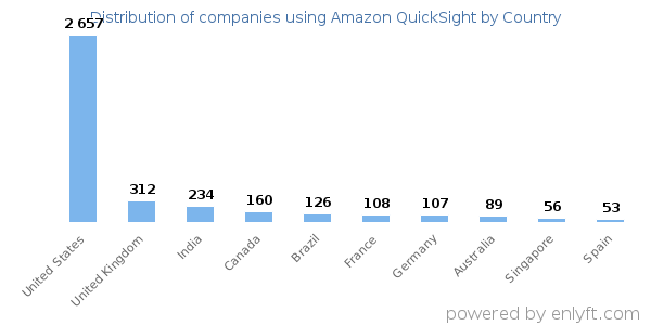 We have data on 4,709 companies that use Amazon QuickSight. The companies using Amazon QuickSight are most often found in United States and in the Information Technology and Services industry. Amazon QuickSight is most often used by companies with 50-200 employees and 10M-50M dollars in revenue. Our data for Amazon QuickSight usage goes back as far as 8 years and 6 months.