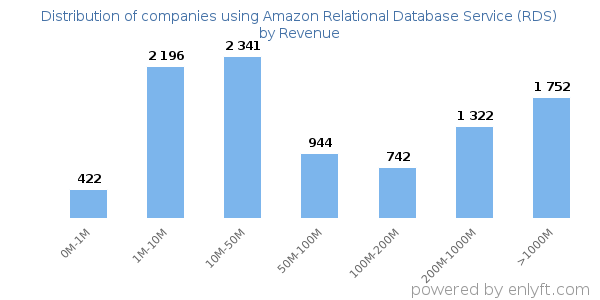 We have data on 10,309 companies that use Amazon Relational Database Service (RDS). The companies using Amazon Relational Database Service (RDS) are most often found in United States and in the Information Technology and Services industry. Amazon Relational Database Service (RDS) is most often used by companies with 50-200 employees and 10M-50M dollars in revenue. Our data for Amazon Relational Database Service (RDS) usage goes back as far as 10 years and 6 months.