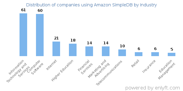 Looking at Amazon SimpleDB customers by industry, we find that Information Technology and Services (19%), Computer Software (19%), Internet (6%) and Higher Education (5%) are the largest segments.