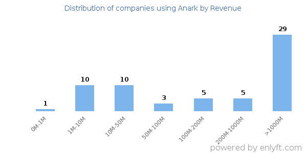 We have data on 63 companies that use Anark. The companies using Anark are most often found in United States and in the Information Technology and Services industry. Anark is most often used by companies with >10000 employees and >1000M dollars in revenue. Our data for Anark usage goes back as far as 5 years and 8 months.