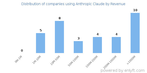 We have data on 34 companies that use Anthropic Claude. The companies using Anthropic Claude are most often found in United States and in the Computer Software industry. Anthropic Claude is most often used by companies with >10000 employees and >1000M dollars in revenue. Our data for Anthropic Claude usage goes back as far as 1 years and 9 months.