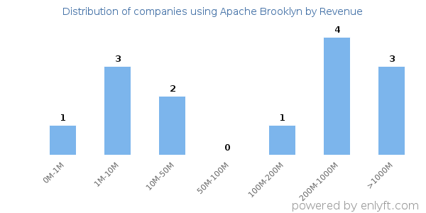We have data on 15 companies that use Apache Brooklyn. The companies using Apache Brooklyn are most often found in United States and in the Information Technology and Services industry. Apache Brooklyn is most often used by companies with 1000-5000 employees and 200M-1000M dollars in revenue. Our data for Apache Brooklyn usage goes back as far as 4 years and 7 months.