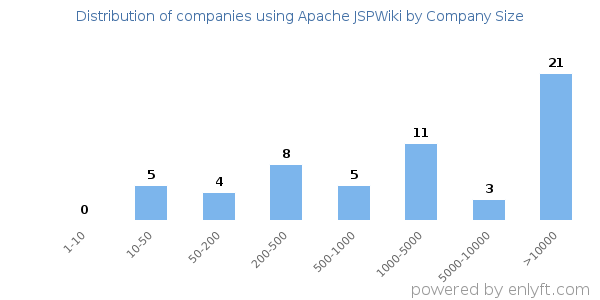 We have data on 57 companies that use Apache JSPWiki. The companies using Apache JSPWiki are most often found in United States and in the Information Technology and Services industry. Apache JSPWiki is most often used by companies with >10000 employees and >1000M dollars in revenue. Our data for Apache JSPWiki usage goes back as far as 4 years and 7 months.