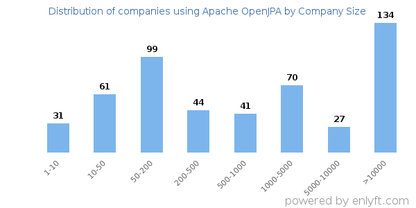 We have data on 517 companies that use Apache OpenJPA. The companies using Apache OpenJPA are most often found in United States and in the Information Technology and Services industry. Apache OpenJPA is most often used by companies with >10000 employees and >1000M dollars in revenue. Our data for Apache OpenJPA usage goes back as far as 4 years and 7 months.