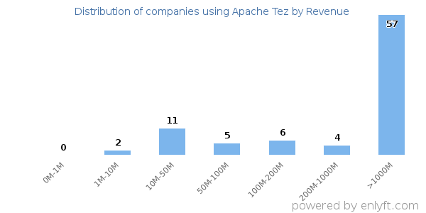 We have data on 86 companies that use Apache Tez. The companies using Apache Tez are most often found in United States and in the Information Technology and Services industry. Apache Tez is most often used by companies with >10000 employees and >1000M dollars in revenue. Our data for Apache Tez usage goes back as far as 4 years and 7 months.