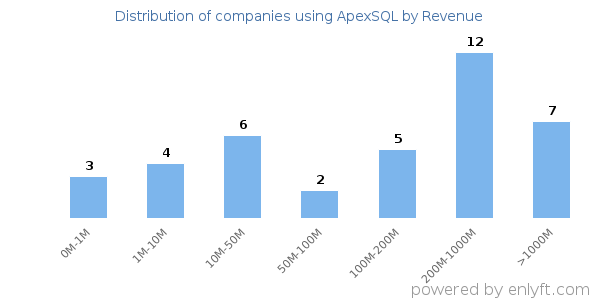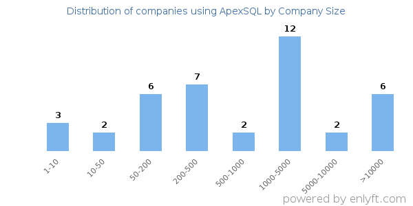 We have data on 41 companies that use ApexSQL. The companies using ApexSQL are most often found in United States and in the Information Technology and Services industry. ApexSQL is most often used by companies with 1000-5000 employees and 200M-1000M dollars in revenue. Our data for ApexSQL usage goes back as far as 2 years and 1 months.
