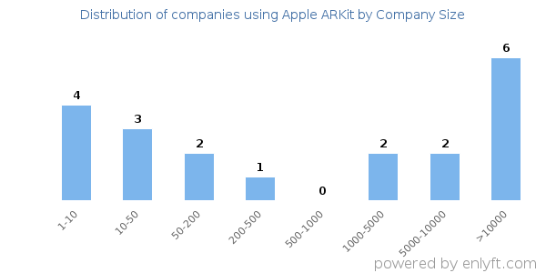 We have data on 20 companies that use Apple ARKit. The companies using Apple ARKit are most often found in United States and in the Computer Software industry. Apple ARKit is most often used by companies with >10000 employees and >1000M dollars in revenue. Our data for Apple ARKit usage goes back as far as 3 years and 2 months.