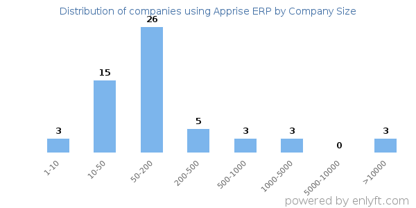 We have data on 59 companies that use Apprise ERP. The companies using Apprise ERP are most often found in United States and in the Manufacturing industry. Apprise ERP is most often used by companies with 50-200 employees and 10M-50M dollars in revenue. Our data for Apprise ERP usage goes back as far as 8 years and 4 months.