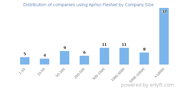 We have data on 92 companies that use Apriso FlexNet. The companies using Apriso FlexNet are most often found in United States and in the Information Technology and Services industry. Apriso FlexNet is most often used by companies with >10000 employees and >1000M dollars in revenue. Our data for Apriso FlexNet usage goes back as far as 8 years and 8 months.