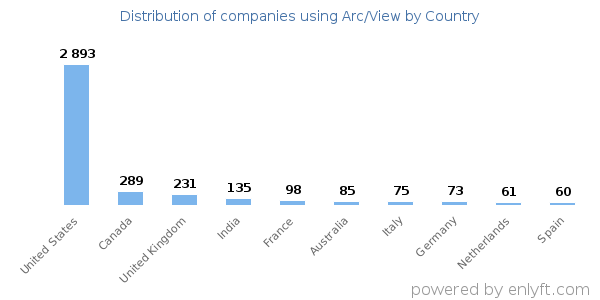 We have data on 4,671 companies that use Arc/View. The companies using Arc/View are most often found in United States and in the Government Administration industry. Arc/View is most often used by companies with 1000-5000 employees and 1M-10M dollars in revenue. Our data for Arc/View usage goes back as far as 10 years and 3 months.