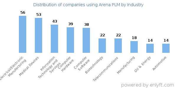 We have data on 561 companies that use Arena PLM. The companies using Arena PLM are most often found in United States and in the Electrical/Electronic Manufacturing industry. Arena PLM is most often used by companies with 50-200 employees and 10M-50M dollars in revenue. Our data for Arena PLM usage goes back as far as 9 years and 2 months.