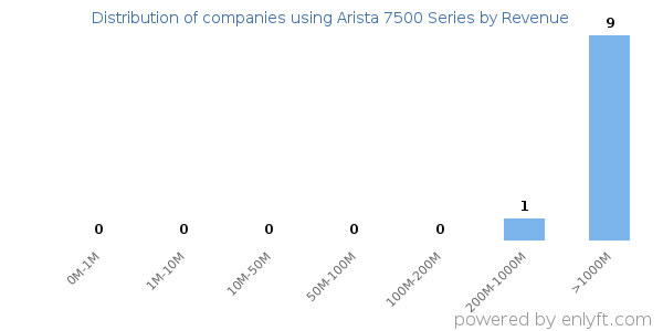 We have data on 11 companies that use Arista 7500 Series. The companies using Arista 7500 Series are most often found in United States and in the Information Technology and Services industry. Arista 7500 Series is most often used by companies with >10000 employees and >1000M dollars in revenue. Our data for Arista 7500 Series usage goes back as far as 1 years and 8 months.