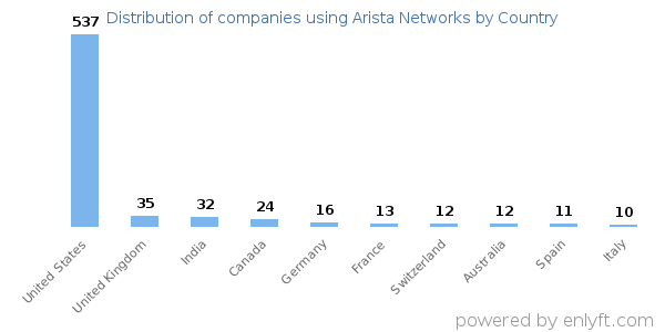 We have data on 811 companies that use Arista Networks. The companies using Arista Networks are most often found in United States and in the Information Technology and Services industry. Arista Networks is most often used by companies with >10000 employees and >1000M dollars in revenue. Our data for Arista Networks usage goes back as far as 9 years and 4 months.