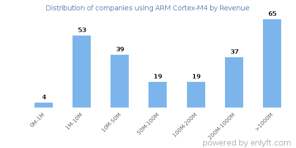 We have data on 248 companies that use ARM Cortex-M4. The companies using ARM Cortex-M4 are most often found in United States and in the Information Technology and Services industry. ARM Cortex-M4 is most often used by companies with >10000 employees and >1000M dollars in revenue. Our data for ARM Cortex-M4 usage goes back as far as 1 years and 11 months.