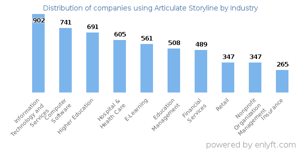 We have data on 11,391 companies that use Articulate Storyline. The companies using Articulate Storyline are most often found in United States and in the Information Technology and Services industry. Articulate Storyline is most often used by companies with 1000-5000 employees and >1000M dollars in revenue. Our data for Articulate Storyline usage goes back as far as 10 years and 1 months.