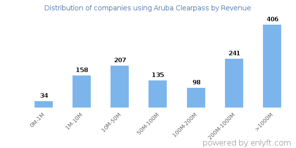 Of all the customers that are using Aruba Clearpass, a majority (50%) are large (>$1000M), 28% are small (<$50M) and 19% are medium-sized.
