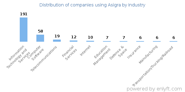 We have data on 477 companies that use Asigra. The companies using Asigra are most often found in United States and in the Information Technology and Services industry. Asigra is most often used by companies with 50-200 employees and 1M-10M dollars in revenue. Our data for Asigra usage goes back as far as 8 years and 8 months.