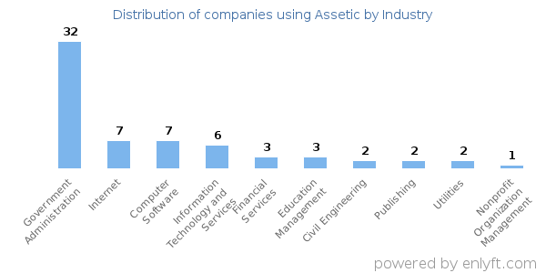 Looking at Assetic customers by industry, we find that Government Administration (36%), Internet (7%), Computer Software (7%) and Information Technology and Services (6%) are the largest segments.
