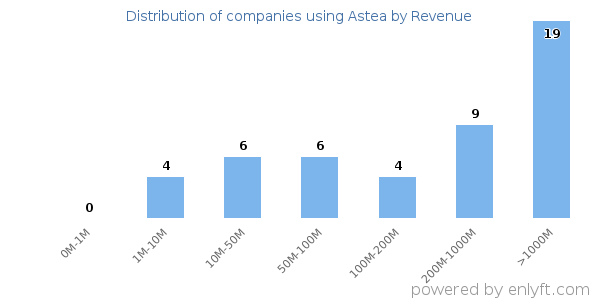 We have data on 49 companies that use Astea. The companies using Astea are most often found in United States and in the Information Technology and Services industry. Astea is most often used by companies with >10000 employees and >1000M dollars in revenue. Our data for Astea usage goes back as far as 9 years and 9 months.