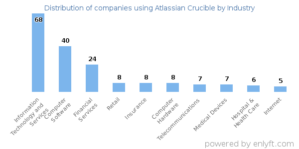 Looking at Atlassian Crucible customers by industry, we find that Information Technology and Services (24%), Computer Software (14%) and Financial Services (8%) are the largest segments.