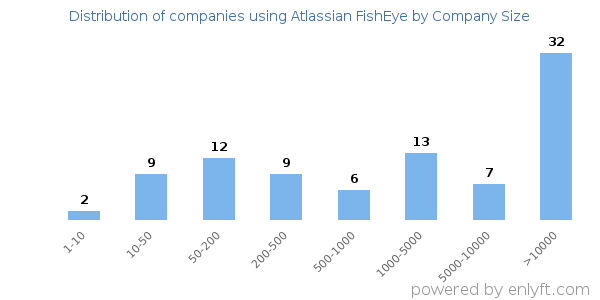 We have data on 90 companies that use Atlassian FishEye. The companies using Atlassian FishEye are most often found in United States and in the Information Technology and Services industry. Atlassian FishEye is most often used by companies with >10000 employees and >1000M dollars in revenue. Our data for Atlassian FishEye usage goes back as far as 10 years and 1 months.