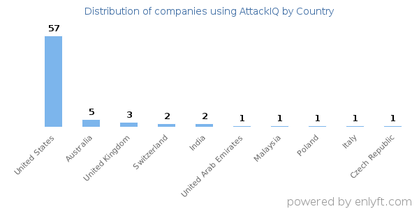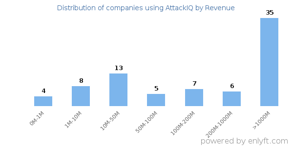 We have data on 86 companies that use AttackIQ. The companies using AttackIQ are most often found in United States and in the Information Technology and Services industry. AttackIQ is most often used by companies with >10000 employees and >1000M dollars in revenue. Our data for AttackIQ usage goes back as far as 3 years and 1 months.