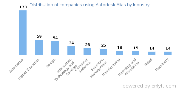 We have data on 618 companies that use Autodesk Alias. The companies using Autodesk Alias are most often found in United States and in the Automotive industry. Autodesk Alias is most often used by companies with >10000 employees and >1000M dollars in revenue. Our data for Autodesk Alias usage goes back as far as 9 years and 4 months.