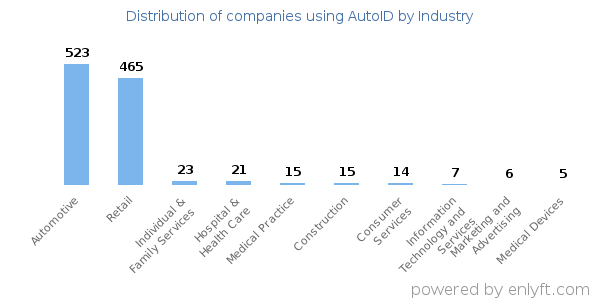 We have data on 1,228 companies that use AutoID. The companies using AutoID are most often found in United States and in the Automotive industry. AutoID is most often used by companies with 10-50 employees and 10M-50M dollars in revenue. Our data for AutoID usage goes back as far as 5 years and 2 months.