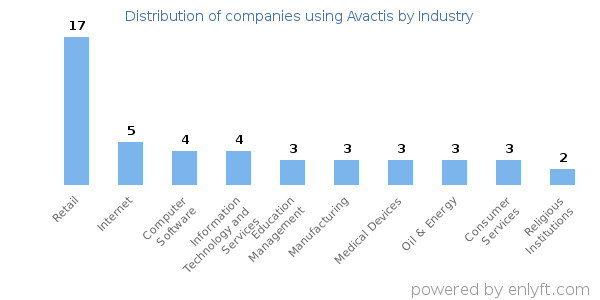 We have data on 117 companies that use Avactis. The companies using Avactis are most often found in United States and in the Retail industry. Avactis is most often used by companies with 1-10 employees and 1M-10M dollars in revenue. Our data for Avactis usage goes back as far as 8 years and 10 months.